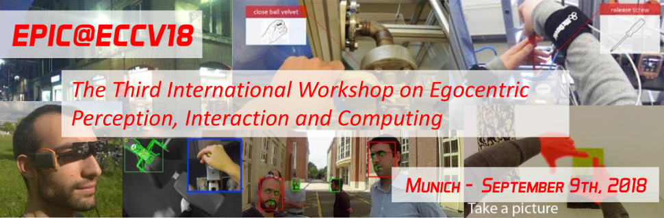 This EPIC@X series of workshops aims to bring together the various communities that are relevant to egocentric perception including Computer Vision, Multimedia, HCI and the Visual Sciences and is planned to be held on the major conferences in these fields. EPIC@ECCV2018 will accept Full Papers for novel work, and Extended Abstracts for ongoing or already published work. Both research and application works related to Egocentric Perception, Interaction and Computing are encouraged, including those that can be demonstrated or are in the prototype stages.